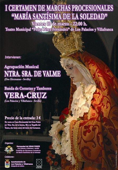 Dicho certamen tendrá lugar el viernes día 13 de marzo, a partir de las 10 de la noche, en el Teatro Municipal “Pedro Pérez Fernández” de Los Palacios y Villafranca. En el mismo participarán la Agrupación Musical Ntra. Sra. de Valme de nuestra vecina localidad de Dos Hermanas, bajo la dirección del conocido compositor José Manuel Mena Hervas, autor, entre otras, de marchas tan conocidas como ¡Oh, Bendita Estrella! ó Ntro. Padre Jesús de la Victoria; así como la palaciega Banda de Cornetas y Tambores Vera-Cruz, presidida por Manuel Cerrada y con la dirección musical de Antonio Manuel Baquero.