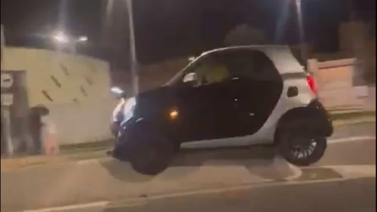 En el vídeo subido a la citada red social, se puede ver como un coche marca Smart de pequeño tamaño está subido en una mediana de Dos Hermanas al lado de la estación de Renfe sin ningún tipo de explicación.
