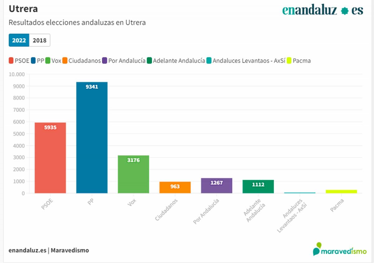 Resultados elecciones andaluzas | Utrera | Con el 100% de escrutinio, el PP ha ganado las elecciones andaluzas en Utrera, consiguiendo 9341 votos y un porcentaje que supera el 40%. El PSOE ha logrado el 26,11% de los votos y 5935 votos, seguido de Vox, que ha cosechado 3176, con un porcentaje de voto del 13,97%.