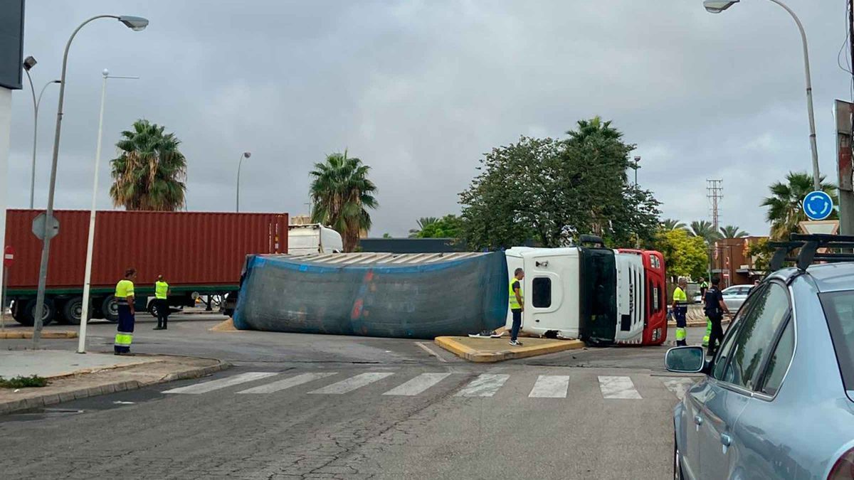 Un camión ha volcado a las 11:00 horas de este jueves en la rotonda de la avenida Alcalde José Dorado Alé, saliendo de la localidad sevillana de Utrera, colapsando el tráfico.
