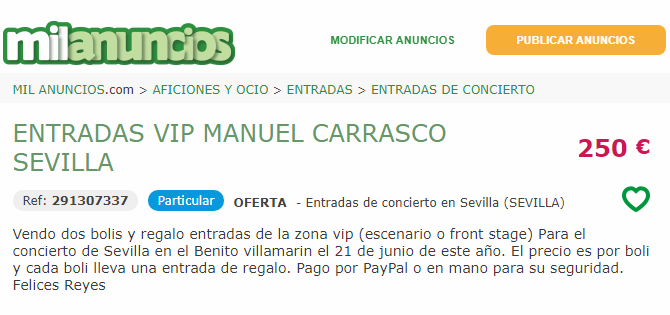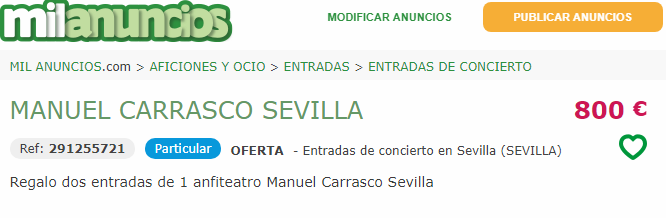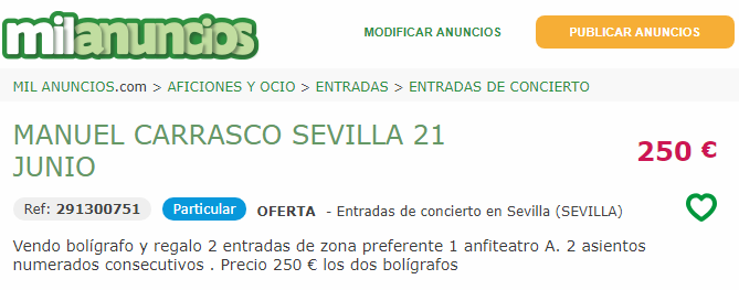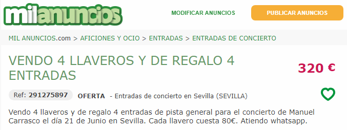 Para intentar esquivar la ley muchos de los anuncios incluso comentan que venden llaveros o bolígrafos y junto con ellos entradas «de regalo». Los precios se elevan hasta los 400€ en el caso de entradas en el primer anfiteatro y llegan hasta los 80€ de pista general (más de dos veces su valor general).