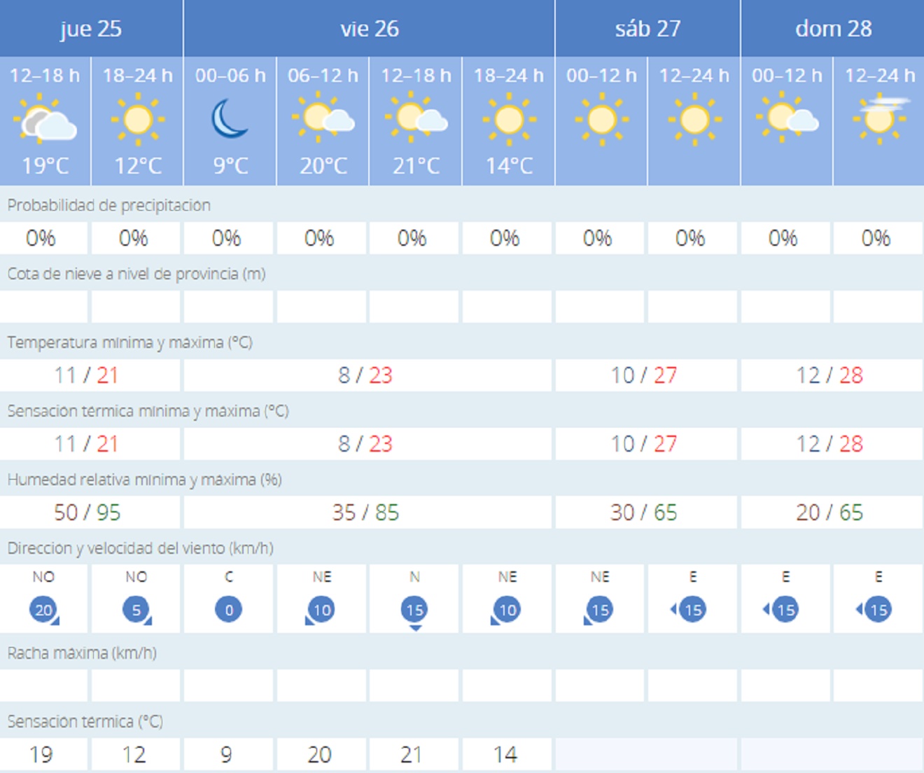 Las temperaturas van a subir progresivamente durante todo el fin de semana. El viernes se esperan las más bajas con 8 grados de mínima y 23 de máxima mientras que el sábado y el domingo subirán hasta alcanzar los 28 grados de máxima. Las mínimas en estos dos días se situarán en torno a los 10 o 12 grados por la mañana.