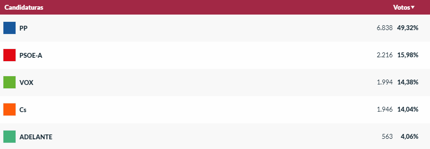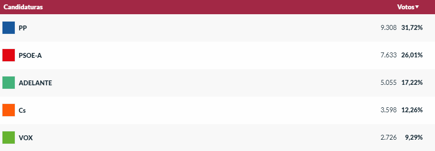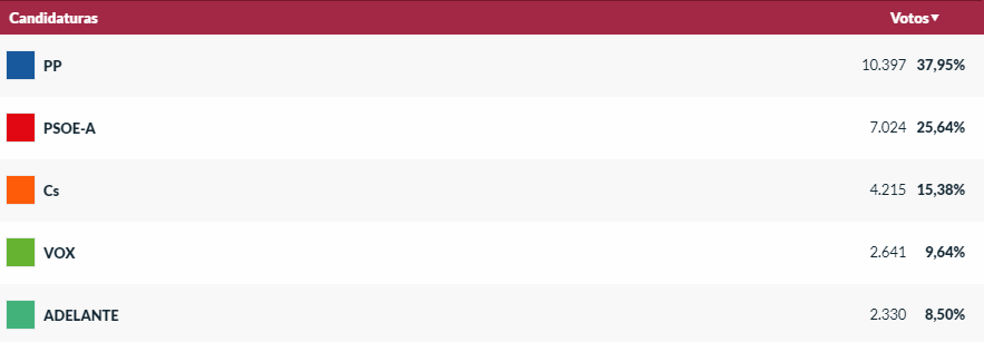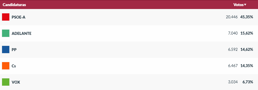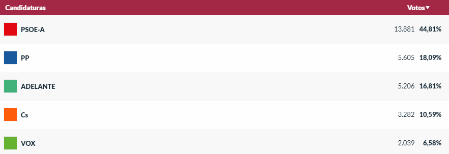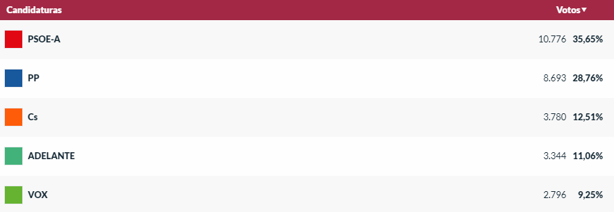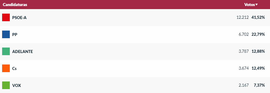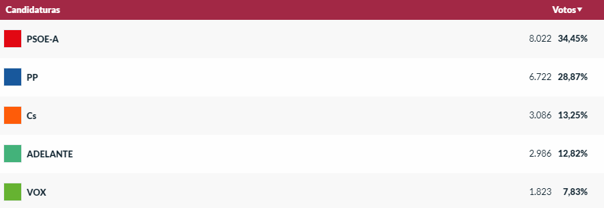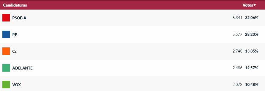 En Bellavista-La Palmera, los socialistas han sido la fuerza más votada aunque muy seguidos del PP. El PSOE ha conseguido 6.341 votos, mientras que los populares 5.577. Ciudadanos con 2.740, Adelante con 2.486 y Vox con 2.072 votos han sido las siguientes fuerzas.