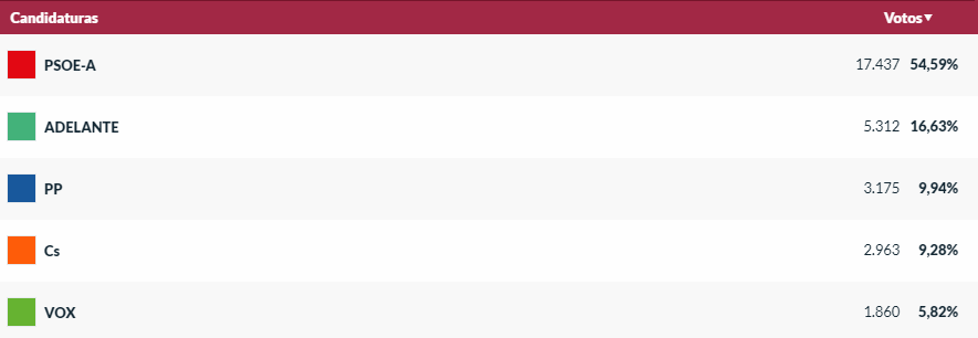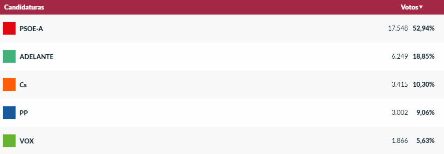 En el Distrito Sur, los socialistas se han impuesto con 10.776 votos (35,65%), cerca de los populares, 8.693 votos y 28,76%. La tercera y cuarta fuerza han sido para Ciudadanos y Adelante, respectivamente y superando los 3.000 votos. Vox ha logrado 2.796.