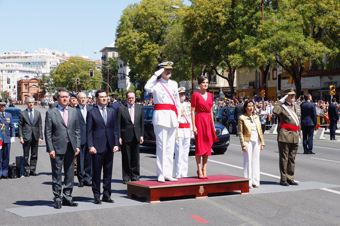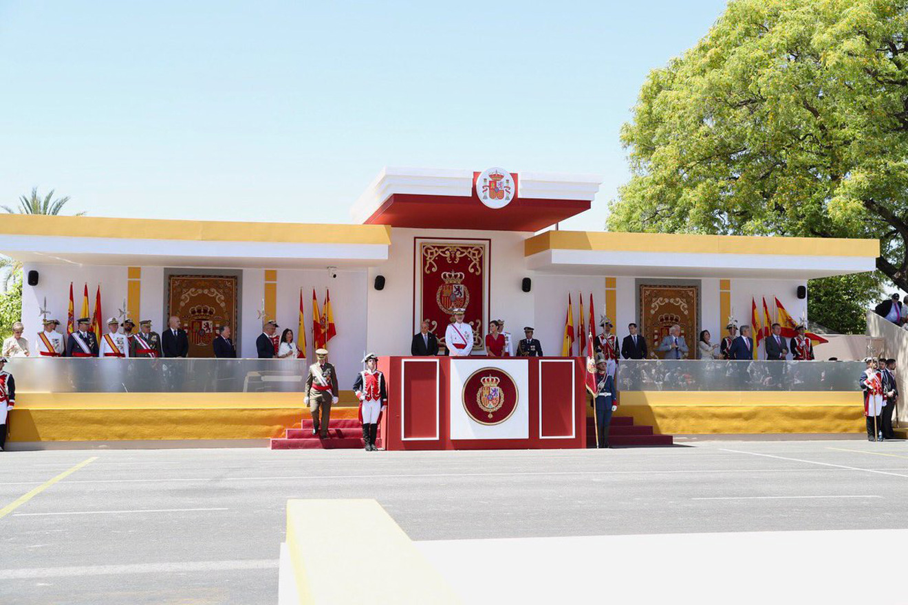 Los Monarcas han sido cumplimentados y acompañados por el presidente de la Comunidad de la Andalucía, Juan Manuel Moreno; la ministra de Defensa en funciones, Margarita Robles; el alcalde hispalense en funciones, Juan Espadas ; el jefe de Estado Mayor de la Defensa, general de Ejército Fernando Alejandre; y los jefes de Estado Mayor de los tres Ejércitos.