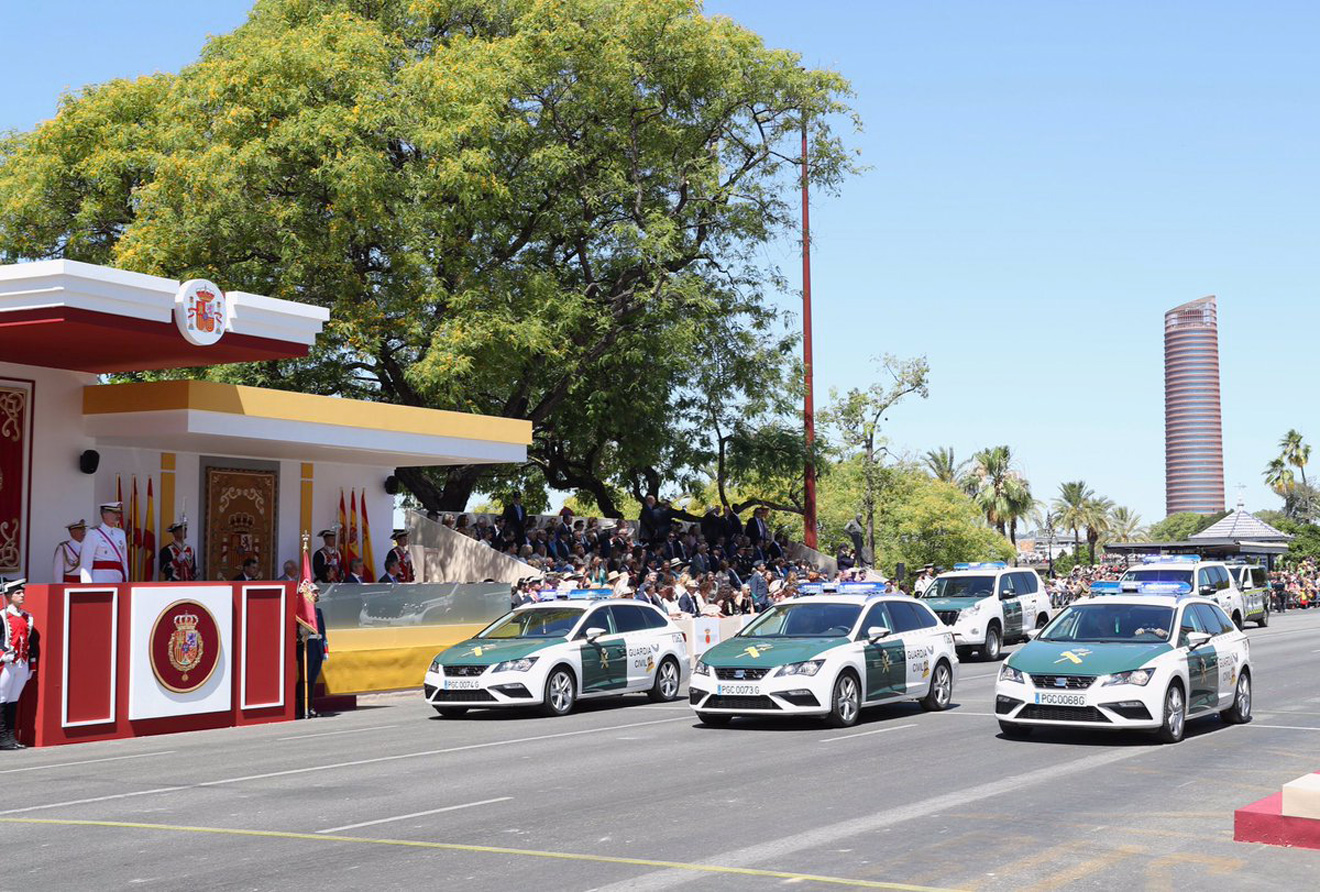 Seguidamente han desfilado las unidades acorazadas, motorizadas y mecanizadas. Entre ellas los carros de combate ‘Leopardo’, los vehículos mecanizados ‘Pizarro’ y los de artillería autopropulsada M-109; unidades lanzapuentes y lanzamisiles ‘Patriot’, vehículos tácticos ‘Lince’, RG-31 y ‘Centauro’, así como los vehículos de alta movilidad de operaciones especiales, antiminas, diversas piezas de Artillería remolcada, y vehículos específicos de la Infantería de Marina, el Grupo Móvil de Control Aéreo, Unidad Militar de Emergencias y Guardia Civil.