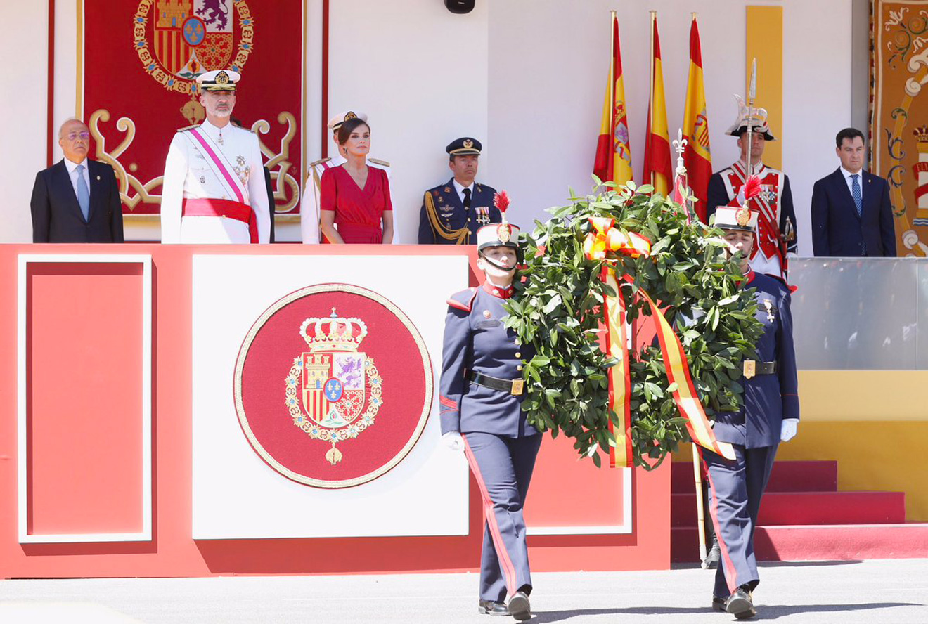 Posteriormente se han realizado el acto solemne de izado y homenaje a la Bandera y el homenaje a los que dieron su vida por España, en el que S.M. el Rey depositó una corona de laurel a los pies del mástil donde se había izado la enseña.