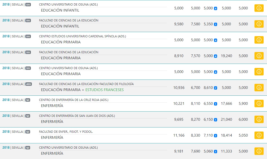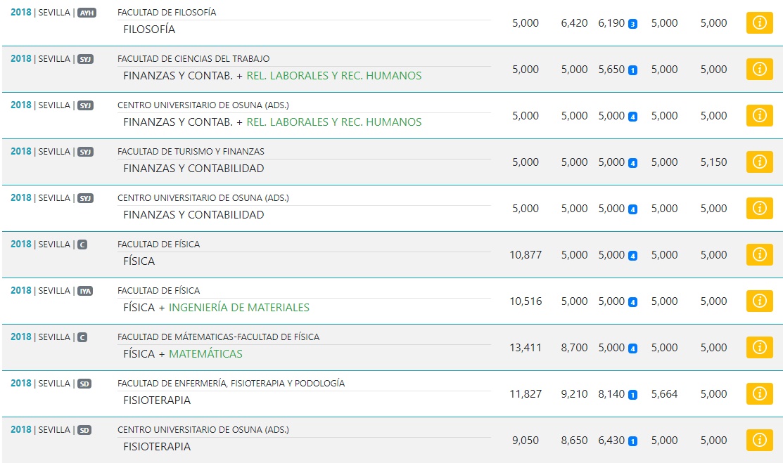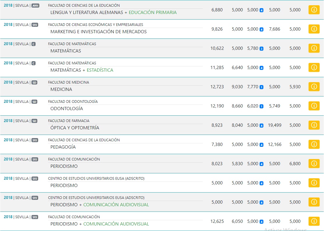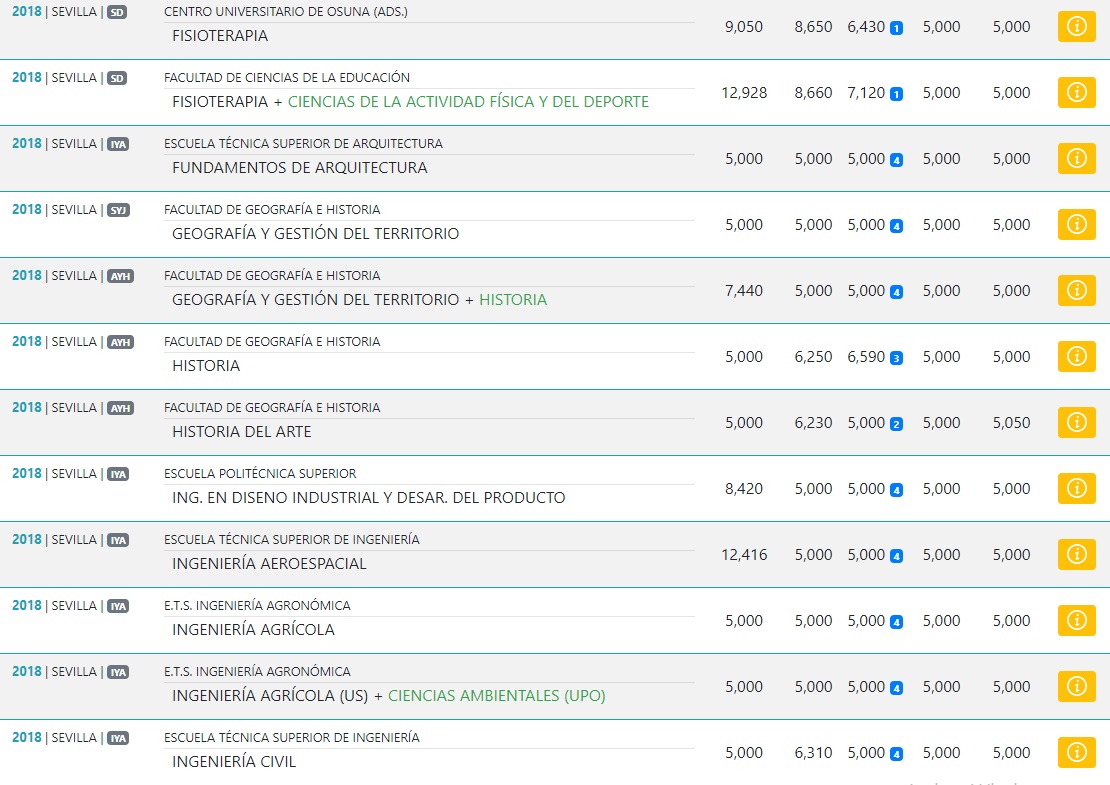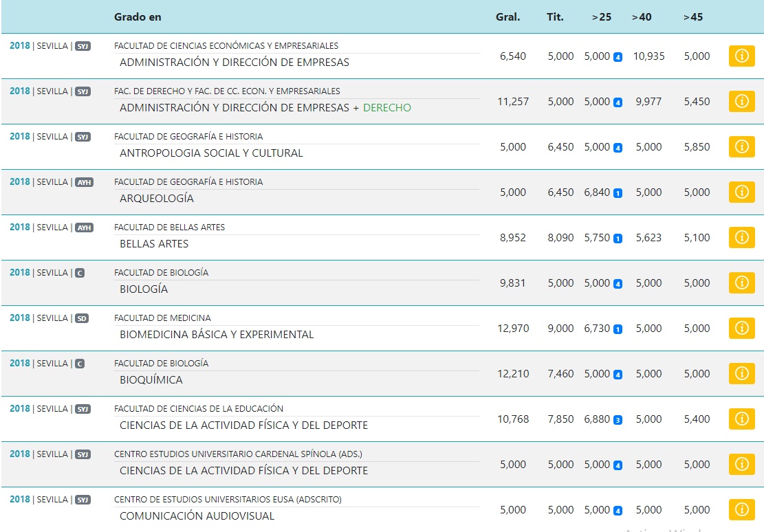 Aquí pueden consultar las notas de corte que tuvo la Universidad de Sevilla el curso pasado. La nota de acceso más alta fue en el grado en Biomedicina Básica y Experimental con un 12,970 seguido del grado de Medicina con dos décimas por debajo. Los indicadores hacen referencia respectivamente al nombre del grado (en orden alfabético), para acceso por PAU y Ciclos Formativos, titulados, mayores de 25, mayores de 40 y mayores de 45.