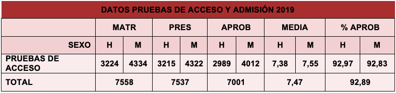 La nota media de los estudiantes que han realizado las Pruebas de Acceso y Admisión ha sido de 7,38 en el caso de los hombres y de 7,55 en el caso de las mujeres.