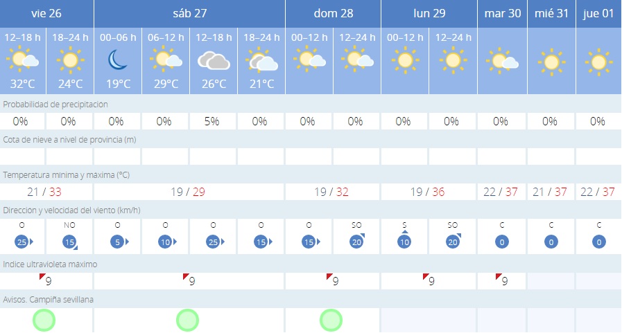 Las altas temperaturas darán un respiro a los sevillanos. Después de varios fines de semanas con máximas cercanas a los cuarenta grados, tanto sábado como domingo descenderán.