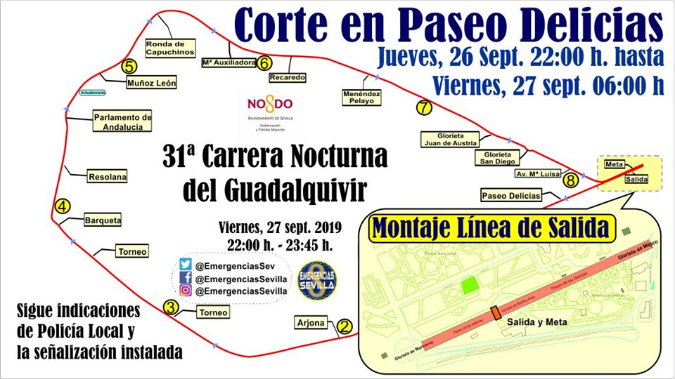 Desde las 21:30 horas se ordenará progresivamente el corte de tráfico en el resto del recorrido por Paseo de las Delicias, Paseo Cristóbal Colón, Torneo, Glorieta Duquesa de Alba, Resolana, Muñoz León, María Auxiliadora, Recaredo, Avenida de El Cid, Glorieta de San Diego, Avenida de María Luisa (donde se instala la meta para los corredores de la modalidad handbike) y Glorieta de los Marineros Voluntarios para llegar de nuevo al Paseo de las Delicias por Glorieta de Buenos Aires.