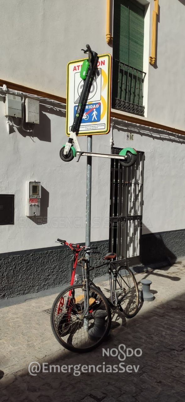 La lucha municipal contra el mal uso de los patinetes eléctricos deja curiosas anécdotas. Las últimas han sido la de un trabajador denunciado tras circular sobre una pila de patinetes y la de un patinete que ha aparecido «aparcado» en lo alto de una señal de tráfico.