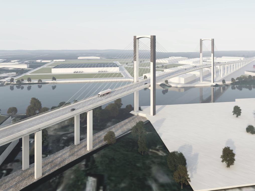 Es una estructura formada por dos viaductos de acceso (estructuras ordinarias de vigas de hormigón prefabricado) y una estructura singular para el paso sobre la dársena mediante un puente atirantado de 564 metros de longitud con un vano principal de 265 m de luz y pilas de 102 m de altura.