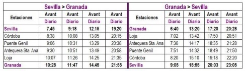 Los nuevos Avant, servicios de Media Distancia por vías de alta velocidad, emplearán un tiempo de viaje de las 2 horas 30 minutos, en función del trayecto, mejorando en hora y media el actual realizado a través de la vía convencional entre Sevilla y Granada, con la desaparición de los actuales trasbordos.