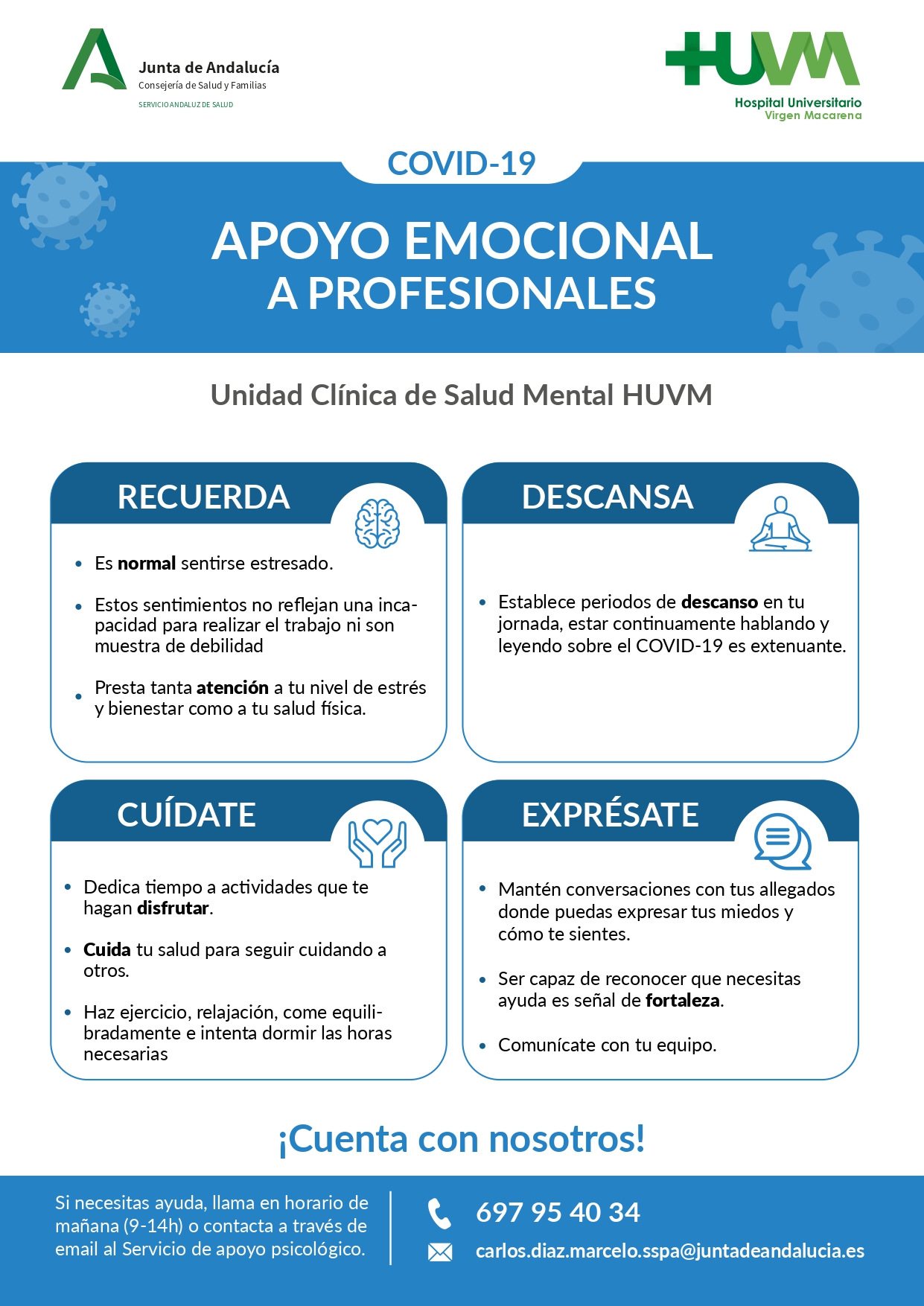La Unidad de Salud Mental del Hospital Universitario Virgen Macarena ofrece desde el pasado 23 de marzo un programa de ayuda psicológica a todos los profesionales sanitarios que realicen actuaciones con pacientes afectados por el Covid-19.