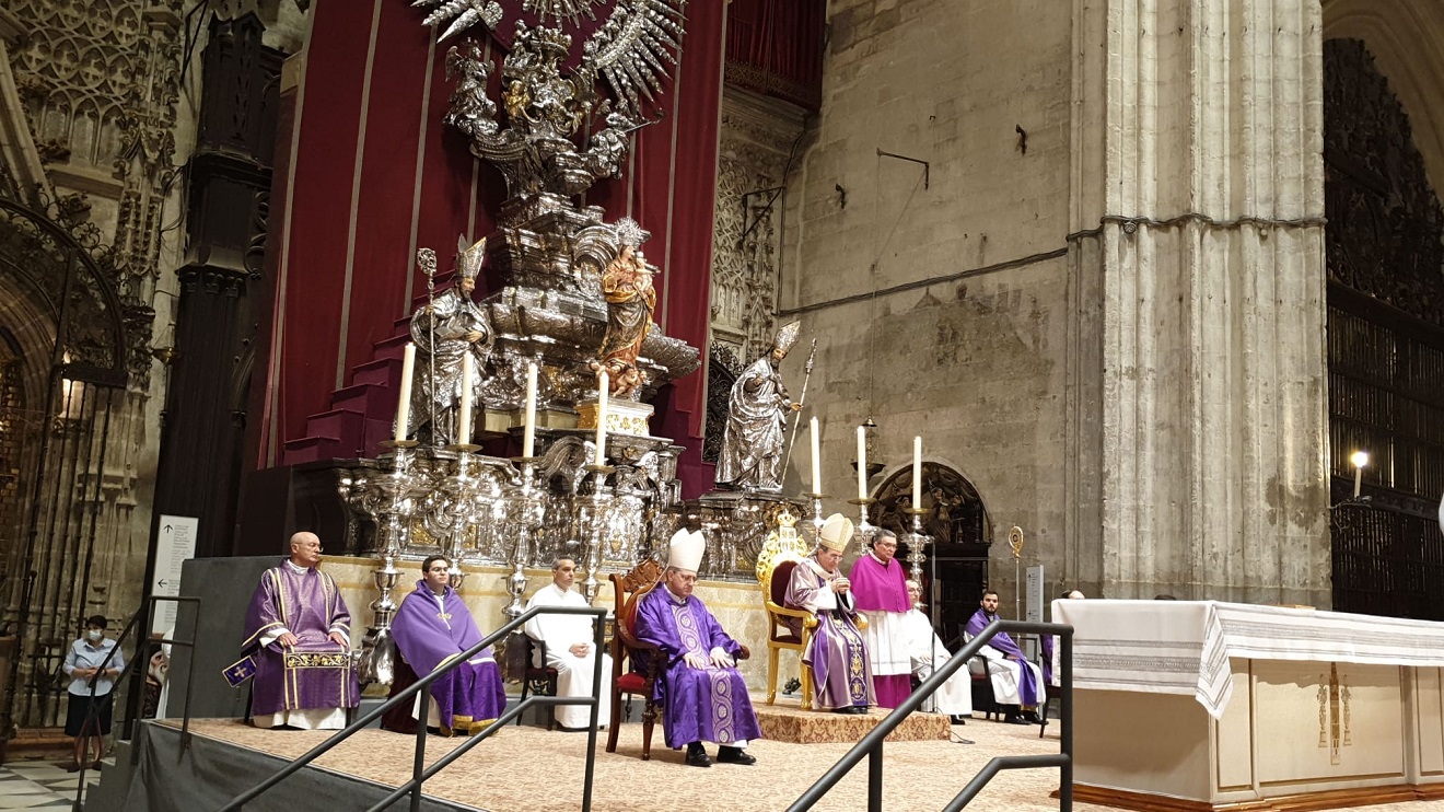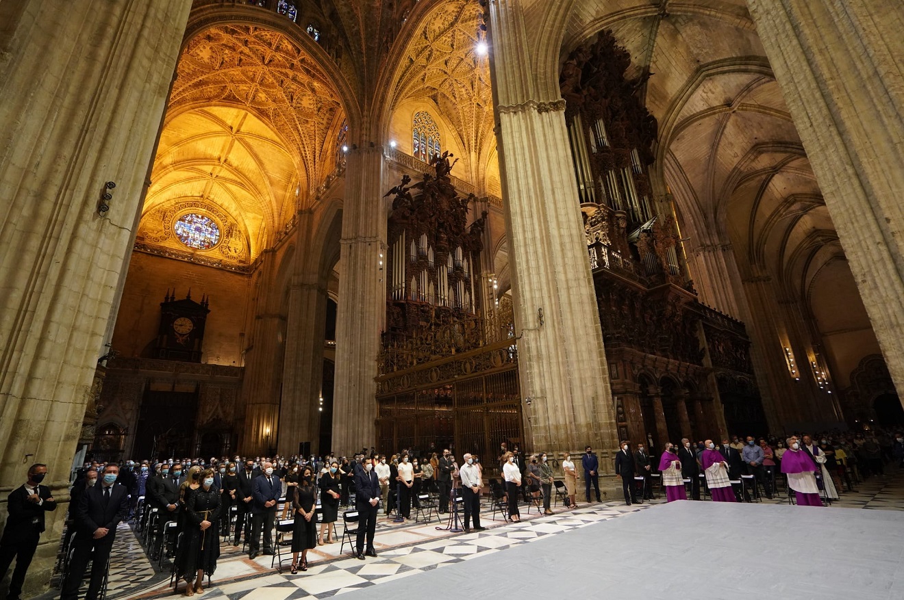 La Catedral de Sevilla acogió este jueves el funeral en memoria de las víctimas de la pandemia del coronavirus. El acto, al que acudieron unos 600 familiares de los fallecidos, estuvo oficiado por el arzobispo hispalense, Juan José Asenjo.