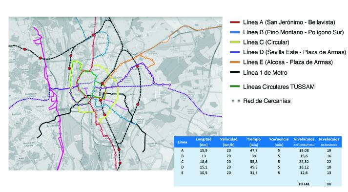 • Red de transporte público metropolitano eficiente con plataformas reservadas, paradas distanciadas a 400 metros con una frecuencia de 5 minutos y un 50% de la velocidad comercial que actualmente tiene los buses TUSSAM