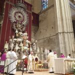 La Catedral de Sevilla ha celebrado hoy la festividad del Corpus Christi más atípica debido a la crisis sanitaria del coronavirus. El templo ha acogido este año una misa y una procesión claustral por sus naves.