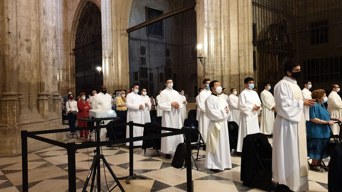 La eucaristía ha estado presidida por el arzobispo de Sevilla, Juan José Asenjo, y ha dado comienzo a las 10:00 horas de la mañana en el Altar del Jubileo. 611 personas han podido acceder a la Catedral. Tras la ceremonia, la procesión claustral ha discurrido con normalidad por las naves de la Catedral de Sevilla. El arzobispo iba escoltado por miembros de Cáritas y sanitarios.