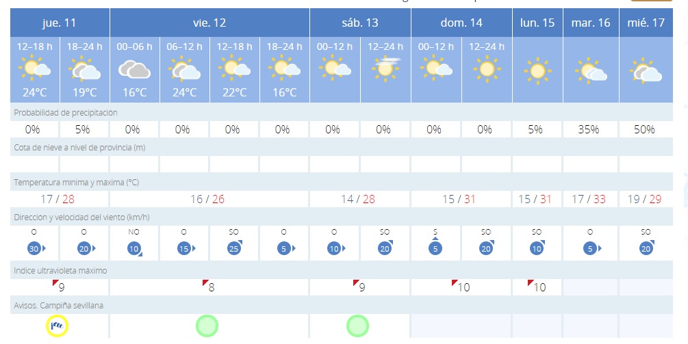 El aviso amarillo por fuertes vientos se activará en la tarde de este jueves en Sevilla, según la Agencia Estatal de Meteorología (AEMET). En concreto, el aviso se activará desde las 16:00 horas hasta las 19:00 horas y se prevén rachas de viento de hasta 70 kilómetros por hora, tanto en la campiña sevillana como en Sevilla capital.