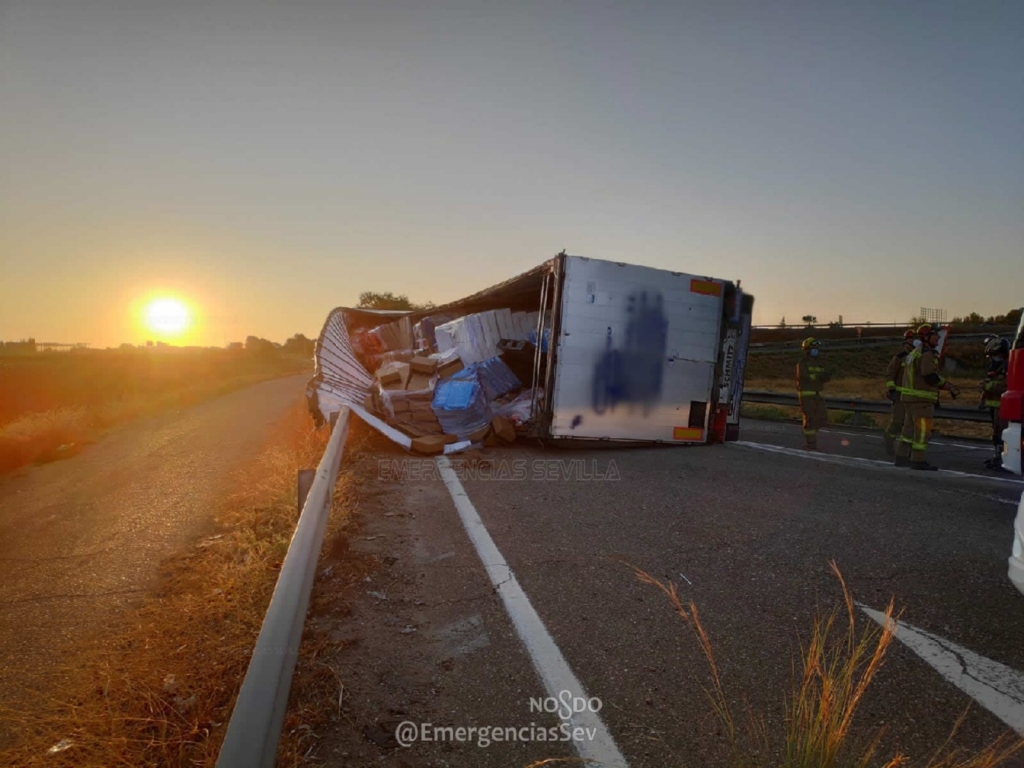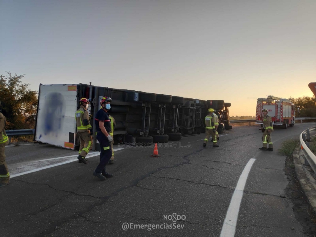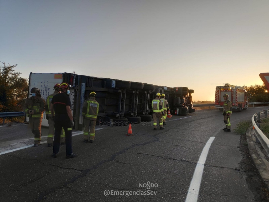 Los equipos de emergencia tuvieron que intervenir a primera hora en un siniestro vial por vuelco de un camión en la incorporación a la SE-020 desde la A-8008 dirección Valdezorras. El conductor resultó ileso.