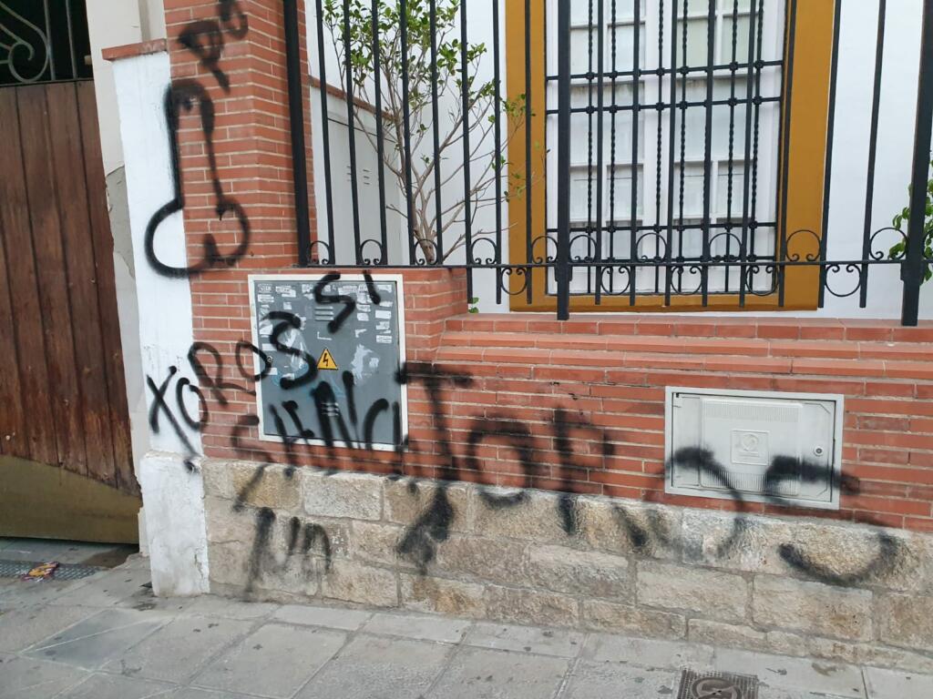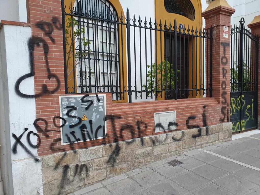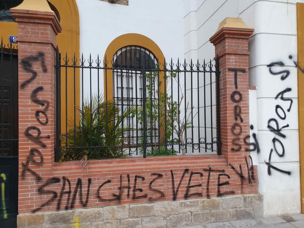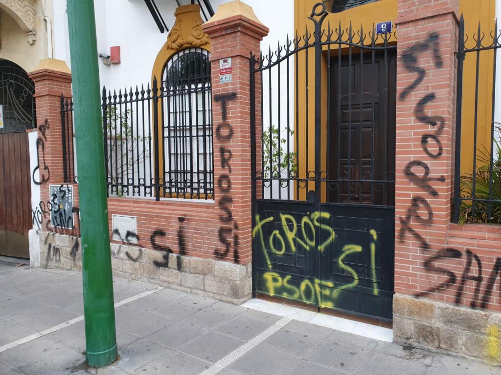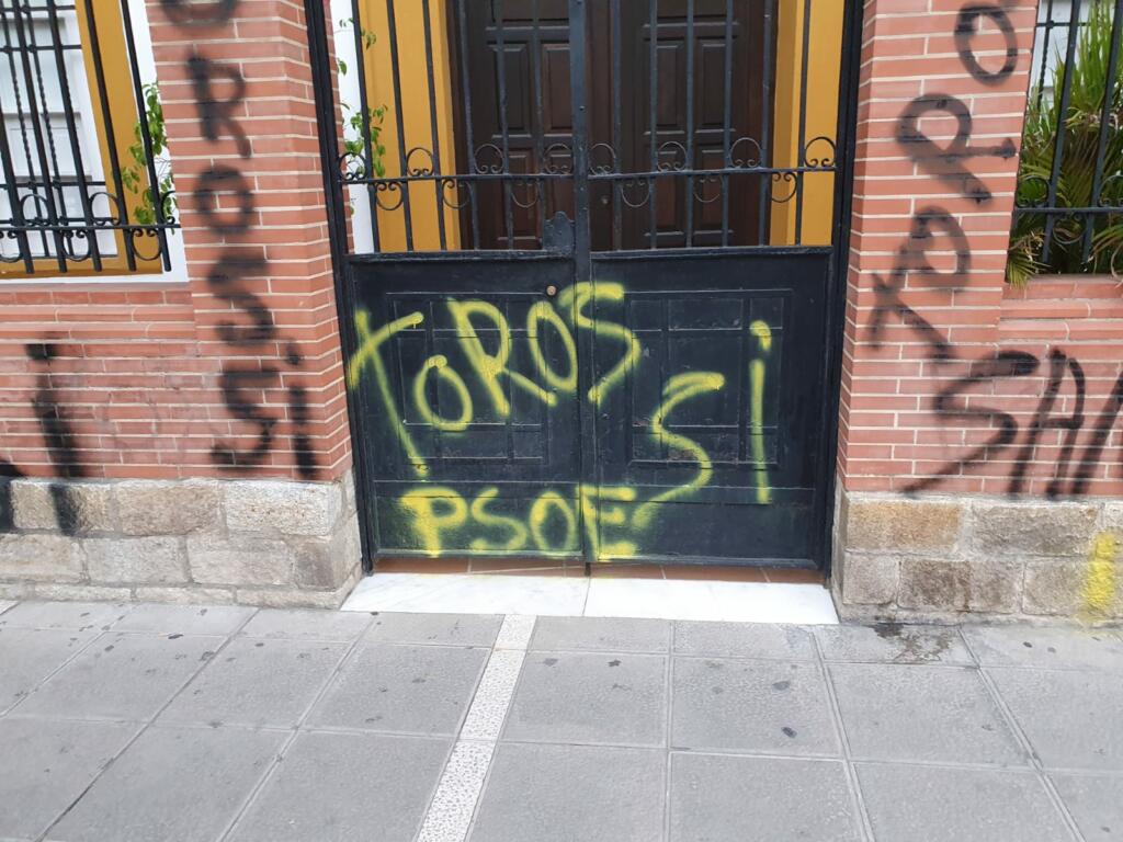 La sede provincial del PSOE ha amanecido con diversas pintadas en la entrada realizadas por autores anónimos, que reflejaban una consigna clara: «Toros sí, Sánchez no».