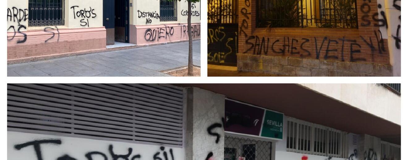Sobre las tres de la pasada madrugada, agentes de la Policía Local de Sevilla, Cuerpo adscrito a la Delegación de Gobernación y Fiestas Mayores del Ayuntamiento, detectaron in fraganti a tres varones que estaban realizando pintadas en la sede del PSOE de la Av. Luis Montoto, nº 8, utilizando para ello botes de spray de pintura, de colores negro, amarillo y rojo, con leyendas a favor del mundo taurino.
