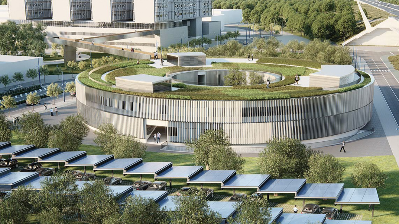 De este modo, la propuesta ganadora presenta una edificación circular desarrollada en dos niveles y semisótano, con un patio central y una cubierta ajardinada, de la que parte una pasarela peatonal elevada que se conecta a nivel de terraza con el CATEPS.