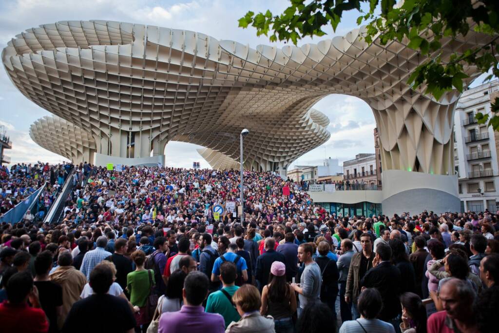 En Sevilla, ese descontento del 15-M también se vio reflejado en las calles, con multitudinarias movilizaciones que llegaron hasta el Palacio de San Telmo, pasando por el Prado de San Sebastián, para ocupar prácticamente la totalidad de las emblemáticas Setas de La Encarnación.