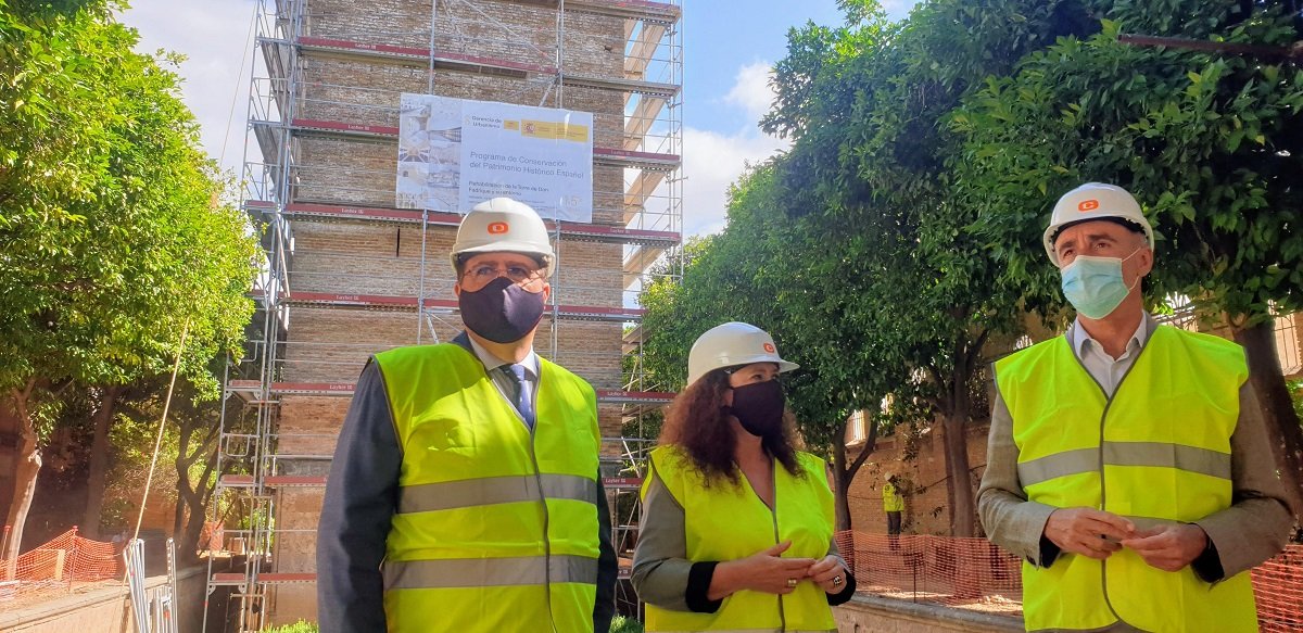 El delegado de Hábitat Urbano, Turismo y Cultura, Antonio Muñoz; el delegado del distrito Casco Antiguo, Juan Carlos Cabrera, y la delegada de Patrimonio, Carmen Fuentes, han visitado estas obras de rehabilitación que permitirán recuperar para visita y uso público la torre, así como la adecuación de los jardines y de la portada de Maese Rodrigo.