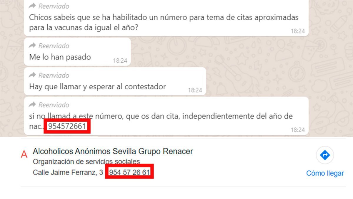 Este número fijo resulta ser el de la Asociación Alcohólicos Anónimos Sevilla Grupo Renacer. Una asociación que ayuda a muchas personas a salir de una enfermedad que afecta a como es el alcoholismo, pero que no vacuna contra la COVID-19.