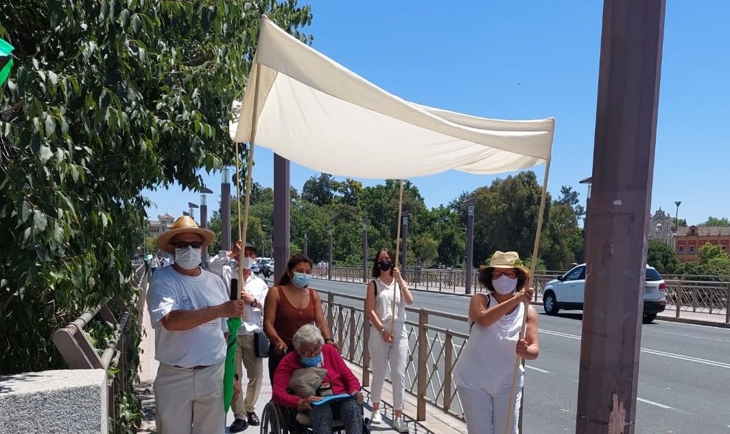 Un grupo de personas ha acompañado bajo su sombra a un palio poco habitual en las calles de Sevilla. No se trataba del palio de Las Cigarreras, sino de un toldo que emulaba la forma de un palio, y esto con el objetivo de pedir sombra para los puentes sevillanos. Esta curiosa iniciativa pretende llamar la atención del Ayuntamiento por la tardanza en colocar los toldos en los puentes de la ciudad, algo que se aprobó por unanimidad en 2017.