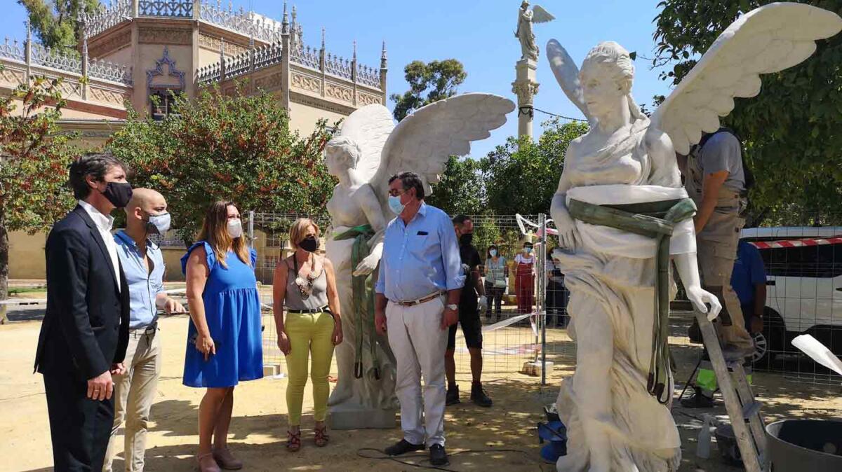 El Ayuntamiento de Sevilla ha culminado los trabajos de la última fase de restauración de las esculturas de las Victorias Aladas de la Plaza de América, en el Parque de María Luisa. En esta ocasión, eran cinco de las 16 obras existentes sobre columnas –tres de ellas del artista Manuel Delgado Branckenbury, una de Pedro Carbonell y otra de Lorenzo Coullaut Valera– las que se han sometido a una minuciosa intervención. En el día de hoy, se han subido a sus pedestales las dos últimas esculturas, con lo que el conjunto artístico queda completamente restaurado.