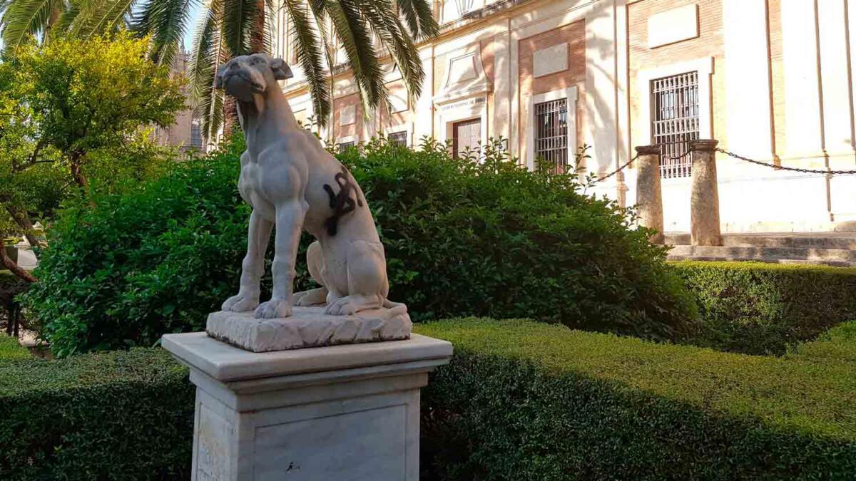Uno de los perros del Jardín de la Lonja, el que se encuentra frente al Archivo de Indias en la Avenida de la Constitución, aparecía el pasado sábado con unas pintadas. Estos perros, fueron retirados en 1985 para después volver a ser repuestos en 2015 y ‘custodiar’ este emblemático edificio de la ciudad.
