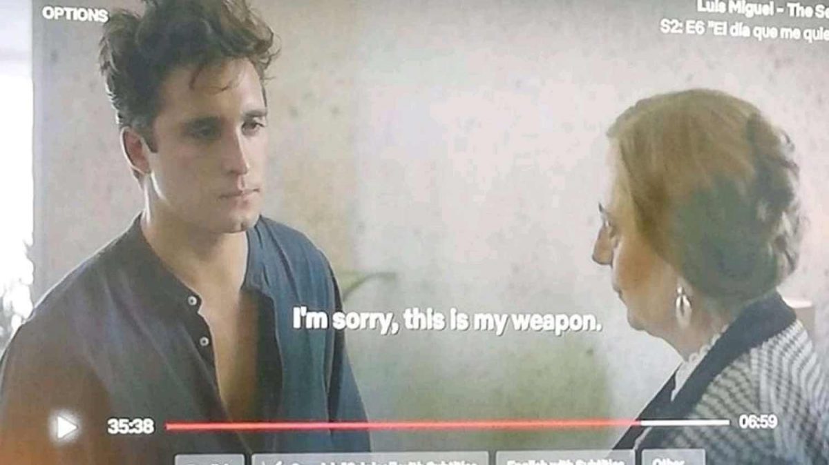 Por su parte, la plataforma de series y películas Netflix ha corregido el error en la traducción y ha sustituido aquel «I’m sorry. This is my weapon» por un -y mucho más correcto a lo que la expresión significa- «I’m sorry, my darling».