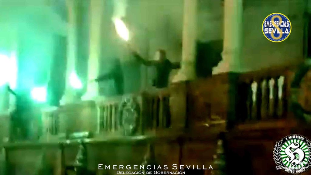 La Policía Local investigan a hinchas del Betis por una celebración con pirotecnia en la Plaza de España. Ya ha identificado en su domicilio al autor de la publicación en redes sociales de un vídeo sobre una celebración pirotécnica no autorizada en Plaza de España.