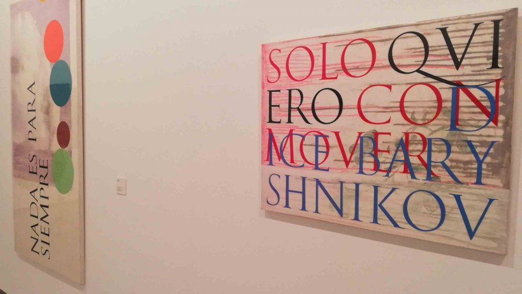 Dividida en tres actos, las piezas se presentan mezcladas en sus técnicas y cronología, procurando una especie de confrontación entre la representación y la abstracción. De esta manera, la Sala Atín Aya como espacio expositivo queda al servicio de un montaje en expansión y tendente a lo instalativo, donde las obras se superponen y quiebran su especificidad. El artista consigue, así, que a veces sea un texto pintado sobre las obras el que incita el pensamiento de quien la contempla y, otras, sea el título el que encauza la reflexión.