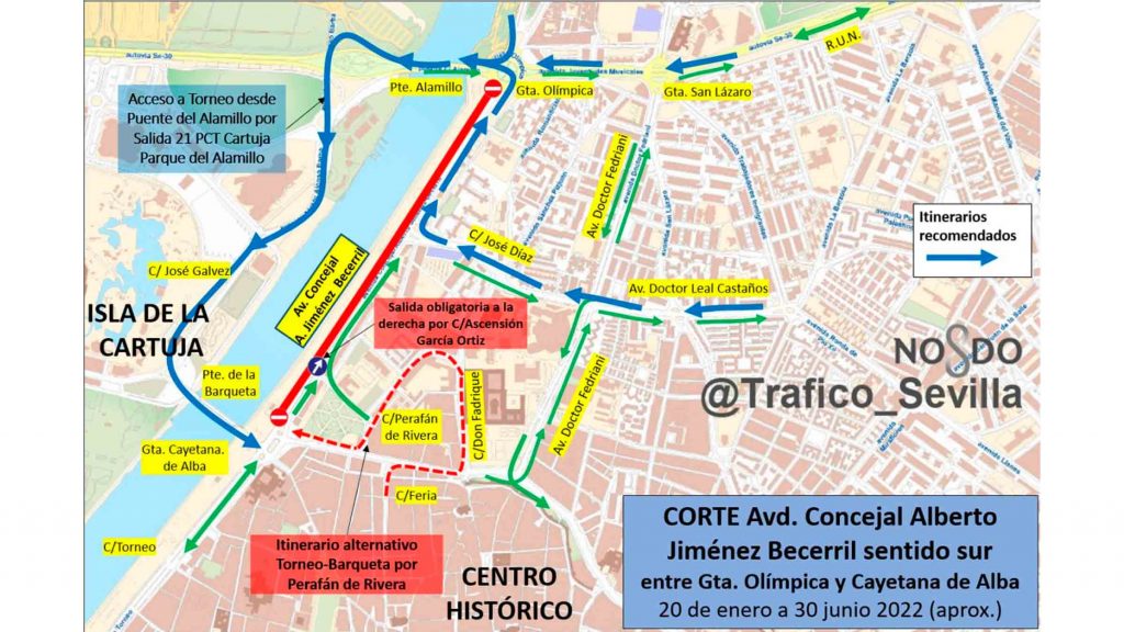 Por este motivo, se recomiendan una serie de itinerarios alternativos. Para los vehículos que procedan de la Ronda Urbana Norte o San Jerónimo en sentido Centro se plantea un itinerario a través del Puente del Alamillo, la Cartuja y el Puente de la Barqueta hasta desembocar en la Glorieta Cayetana de Alba. Del mismo modo, el acceso al Centro desde el Aljarafe por la SE-30 se recomienda a través de la calle José Gálvez y el Puente de la Barqueta. Igualmente, se habilita de forma provisional la salida hacia la derecha en dirección a la Barqueta desde la calle Perafán de Rivera a través de la Resolana para posibilitar la salida de los vehículos.