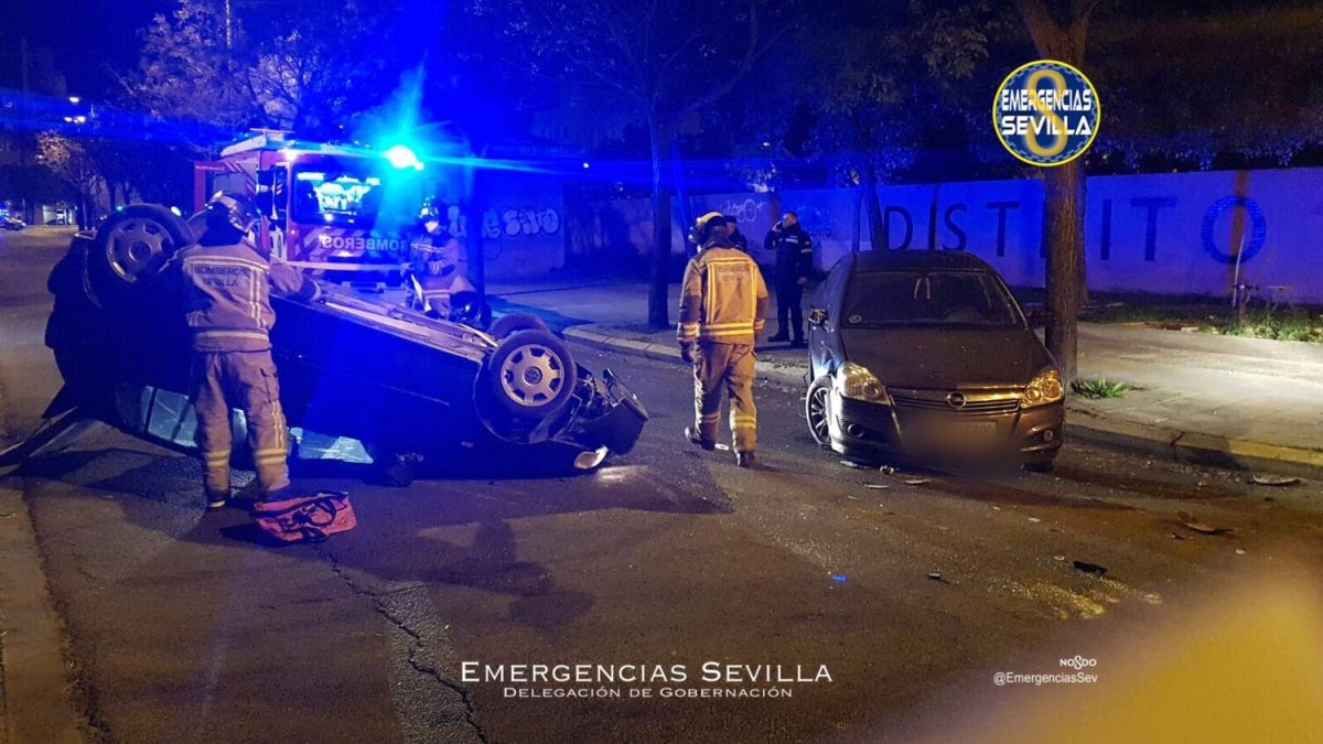 Una mujer ha volcado su coche en la calle Luis Rosales, en Sevilla, tras perder el control del vehículo e impactar contra los coches aparcados en la vía.