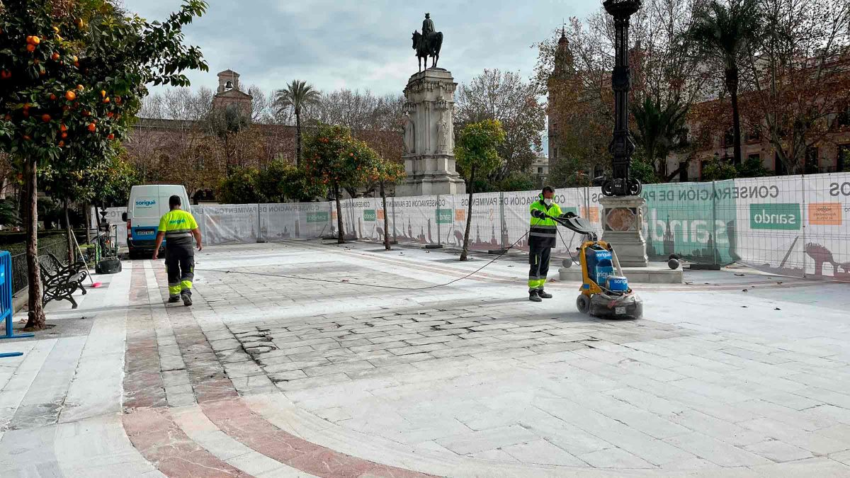 El Ayuntamiento de Sevilla está llevando a cabo trabajos en el pavimento en la Plaza Nueva dentro del nuevo contrato de conservación y mantenimiento de los espacios y viario de la ciudad que ha incrementado en un 150% los recursos económicos asignados y ha triplicado la capacidad de actuación.