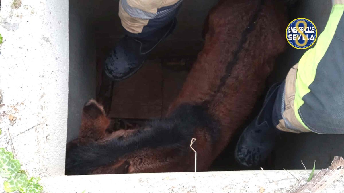 La yegua no se apartaba del lugar, junto a los agentes, que solicitaron la presencia de un equipo de Bomberos. Los bomberos de Sevilla, utilizando arneses especiales para el traslado de animales, rescataron al potro hasta el exterior comprobando que estaba ileso. La yegua y su potro abandonaron el lugar hacia una zona alejada de la carretera.