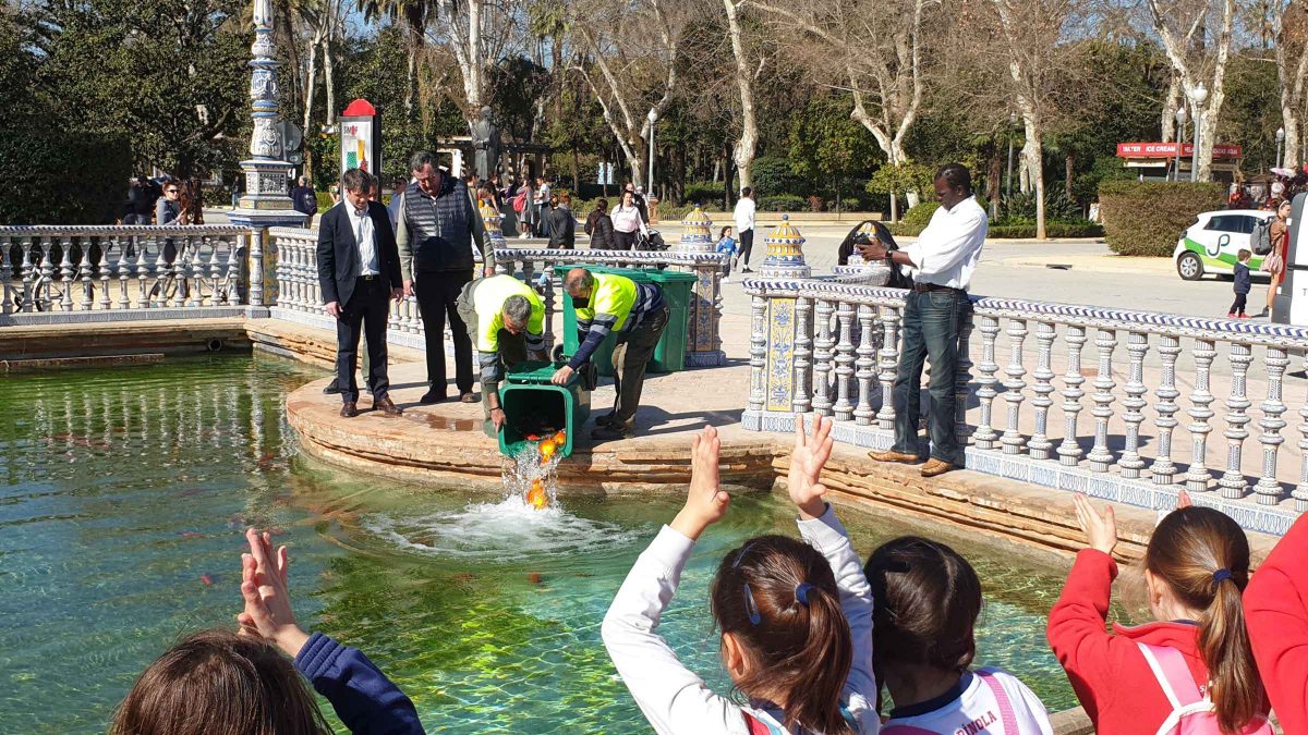Una vez al año, el consistorio sevillano procede «a la limpieza integral de la ría de la Plaza de España». Unas labores que se llevan a cabo con agua a presión para eliminar los restos acumulados tanto en el fondo y las paredes. Tal tarea, obliga al vaciado por completo de su estanque y por ende, del traslado de los peces que habitan en él a otro embalse artificial de agua.
