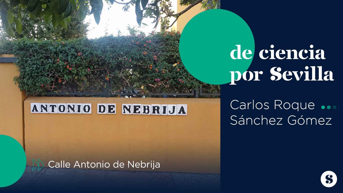 En su V centenario. Ubicada en el sevillano barrio residencial conocido como Ciudad Jardín (41005) -conjunto de pequeños chalets unifamiliares construido para la Exposición Iberoamericana de 1929, dentro del distrito de Nervión-, con sus 429 m de longitud esta calle Antonio de Nebrija discurre entre las rotuladas como Francisco Varela donde empieza y Juan Bautista donde termina. Inicialmente denominada calle 25, con un lustro de retraso conmemorativo natalicio, en 1949, pasó a ser rotulada en honor y memoria del humanista y gramático que trajo la modernidad al español, entre otros importantes logros sociales y culturales.