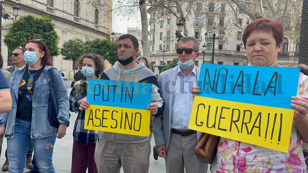 La población de ucranianos en Sevilla ha salido este domingo a las calles a manifestarse por la paz en su país, quien se encuentra actualmente en mitad de un conflicto bélico iniciado por Rusia. Al grito de "no a la guerra" y bajo lemas como "paz para Ucrania", "no esperéis más, hay que actuar ya", "solo juntos vamos fuerte" o "Rusia atrás, Ucrania quiere paz", españoles y ucranianos han protestado con pancartas y banderas frente al Ayuntamiento hispalense.