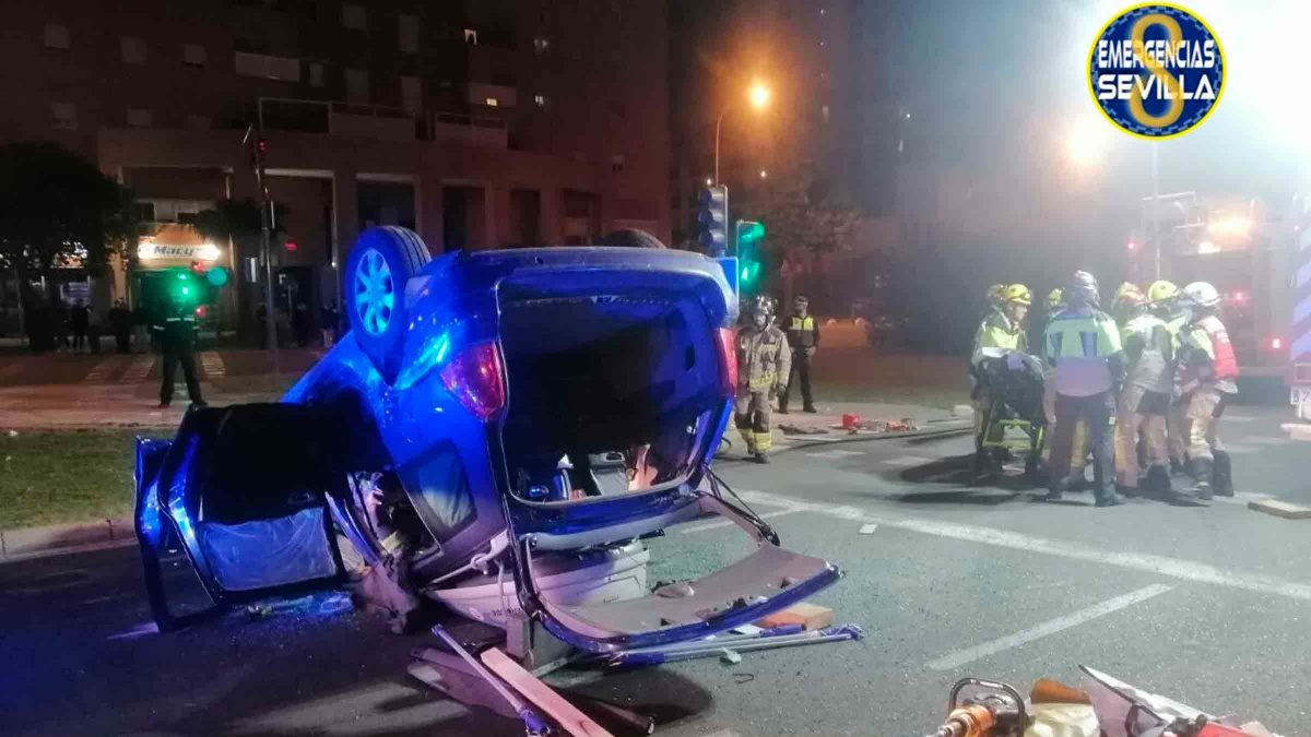 Un hombre de 41 años ha tenido que ser hospitalizado después de un accidente en el que que su vehículo impactó con otro en un cruce de la Avenida de la Aeronáutica, en Sevilla Este. El vehículo quedó volcado totalmente y se necesitó la intervención de los Bomberos para sacar a la víctima y dar la vuelta al vehículo.