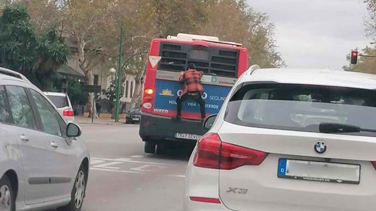 Una persona, bastante hábil, ha viajado colgado de la parte trasera de un autobús de Tussam por la zona de Los Remedios. Unas imágenes en el perfil de Social Drive en Twitter ha corrido como la pólvora y se ha hecho viral en las redes sociales.