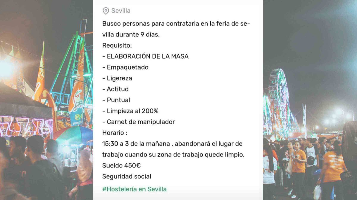 Es el caso de esta oferta de trabajo publicada en un portal de empleo para la Feria de Sevilla. En la descripción se especifica que la persona que postule al puesto deberá saber empaquetar, ser ligero, tener actitud, ser puntual, limpio «al 200%» y poseer el carnet de manipulador de alimentos. La jornada: de 15:30 a 3:00 de la madrugada, once horas y media, todo por 450 euros los nueve días. Eso sí, estará dado de alta en la Seguridad Social.