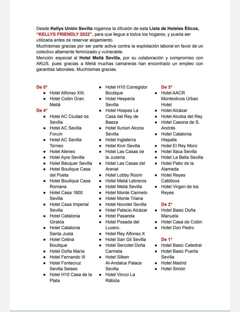 Las Kellys, la asociación de las camareras de pisos que opera a nivel nacional, ha publicado un listado con los hoteles de Sevilla que consideran éticos. Esta lista se ha realizado teniendo en cuenta el trato del establecimiento a las trabajadoras y por eso piden que se tenga en cuenta antes de reservar las vacaciones para el próximo verano.