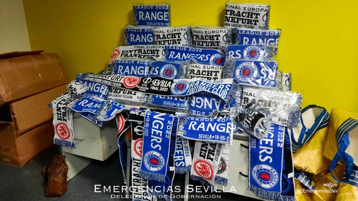 La Policía Local de Sevilla ha intervenido 400 bufandas falsificadas conmemorativas de la final de la Europa League entre el Eintracht de Frankfurt y el Rangers de Glasgow que se celebra a las 21:00 horas de este miércoles en el estadio Ramón Sánchez Pizjuán.