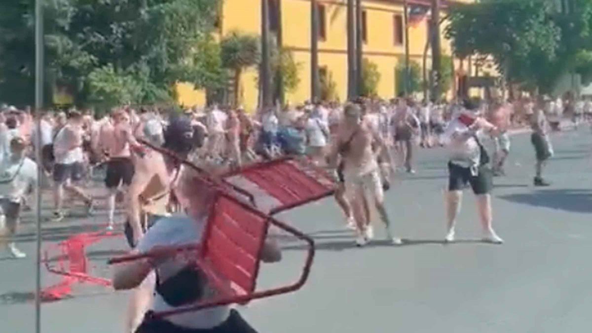 Nuevo episodio de violencia entre aficionados alemanes y escoceses, con un enfrentamiento en la Puerta de la Carne, frente a la Diputación de Sevilla, con momentos de tensión tras el lanzamiento de sillas y mesas de los establecimientos hosteleros de la zona.